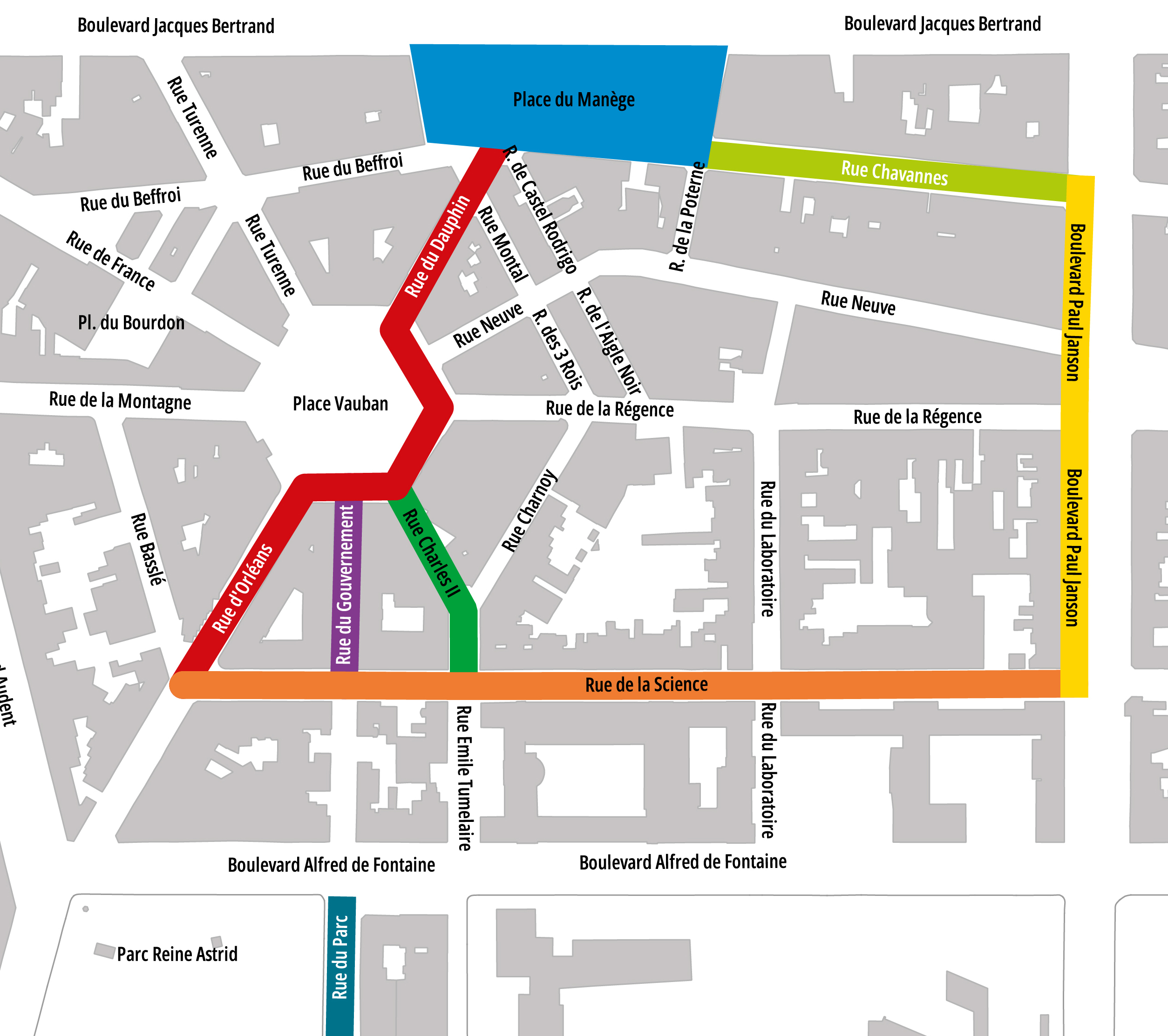 Le nouveau parcours tient compte de la configuration urbaine actuelle : il réintègre les places Vauban et du Manège, la rue du Dauphin et la rue Chavannes, tout en conservant l’esprit d’une boucle fluide et fonctionnelle.
